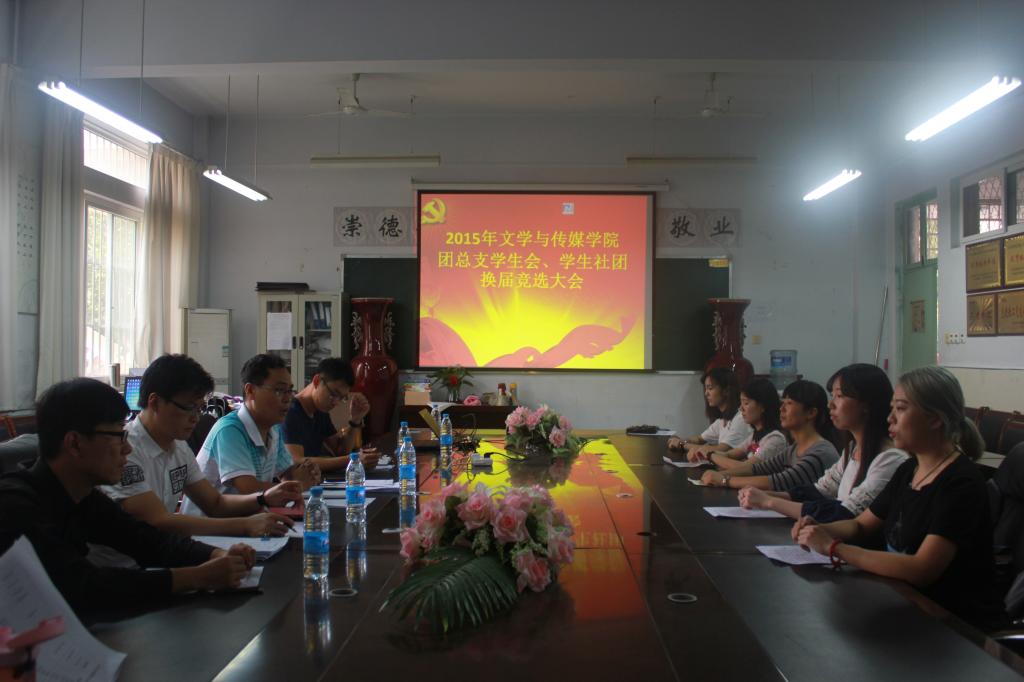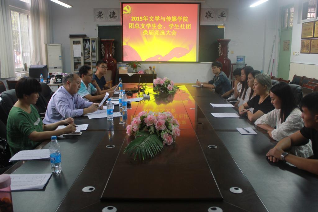 9月18日下午两点半,太阳城集团在A3楼二楼会议室举行了2015年团总支员工会及员工社团主要员工干部换届竞选。文学与传媒公司党总支书记赵新军、副书记赵茹,团总支书记黄高锋,辅导员訾冉、韩慧鸽、黄杰、刘亚铭等老师担任评委。近百名13、14级员工参加了竞选。