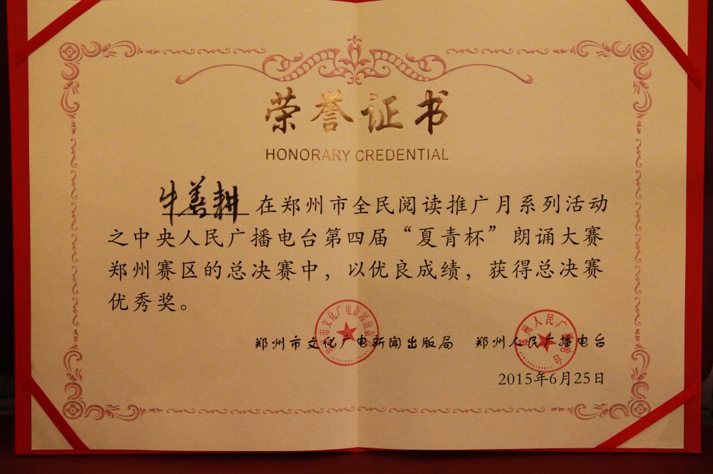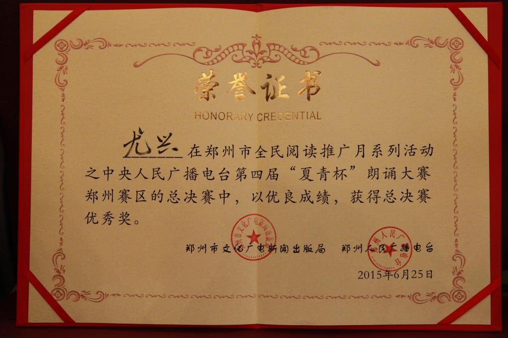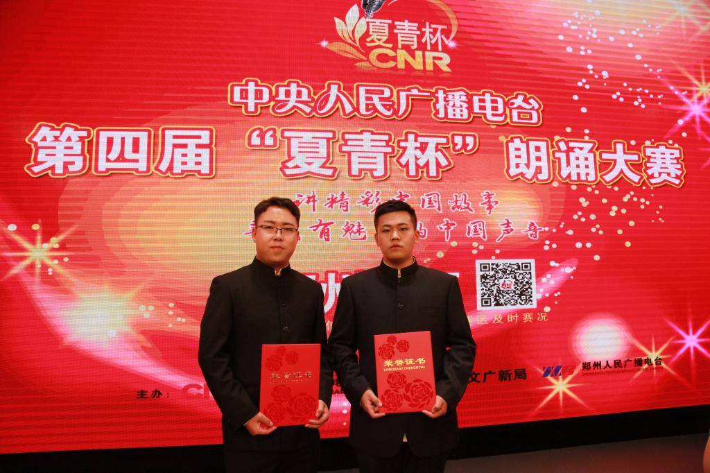 在比赛前后,公司领导老师高度重视,积极组织同学参加,并指定专业老师进行指导。中央人民广播电台第四届“夏青杯”全国朗诵大赛郑州赛区于2015年4月1日启动,历时3个月,吸引了各地近千名朗诵爱好者的参与。经过层层选拔,150名选手进入复赛,30名选手晋级决赛。公司员工尤兴、牛善耕凭借扎实的基本功,在近千名朗诵爱好者中脱颖而出,凭借诗朗诵《燃烧吧,青春的火光》最终荣获优秀奖。