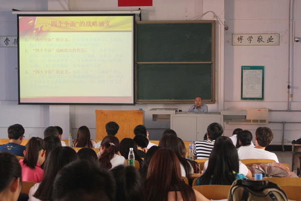 会上,赵书记首先从“四个全面”出发,为大家讲述了“四个全面”的内涵及战略意义,讲解了社会主义核心价值体系的形成、发展及内涵,阐释了中国特色社会主义共同理想、中国精神、社会主义荣辱观及社会主义核心价值观的内涵。随后,赵书记给大家讲述了实现中国梦的途径:一要走中国特色社会主义道路;二要弘扬以爱国主义为核心的民族精神和以改革创新为核心的时代精神;三要凝聚中国各族人民大团结的力量;四要坚持中国共产党的领导。最后,赵书记对大家提出了“志存高远,勤奋学习,立志报国”的殷切希望。他强调,同学们要坚定理想信念,树立远大志向,勤奋学习,加强品德修养,锤炼意志品格,汇聚社会正能量,为中国梦的早日实现增添一份自己的力量。