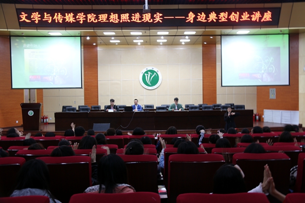 李锐首先为大家讲述了自己创办锐之友家教中心的历程,回忆了创业之路的挫折与艰辛,分享在期间的收获与感慨。他说到:“在创业路上,要学会忍受孤独,更重要的是坚持。在这条路上,你会有许多挫折,但同时,你也会收获许多。”他以自己的实际创业经历鼓励学广大在校员工要有创业意识,勇于自己创业,收获不一样的人生。随后,郭一盟讲述了自己的专业学习之路与成立个人工作室的经历。他以自己执着追求播音专业的经历告诉同学们,兴趣是最好的老师。凭着对播音专业的热爱与努力,他坚持到了今天,成立了个人工作室。郭一盟在讲述奋斗历程的同时,还为大家播放了自己录制的优秀广告作品。李锐和郭一盟的创业路和质朴的话语深深吸引着同学们,赢得了大家的阵阵掌声。